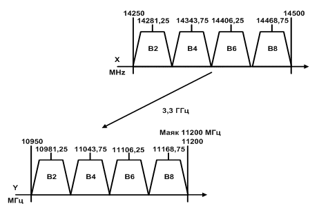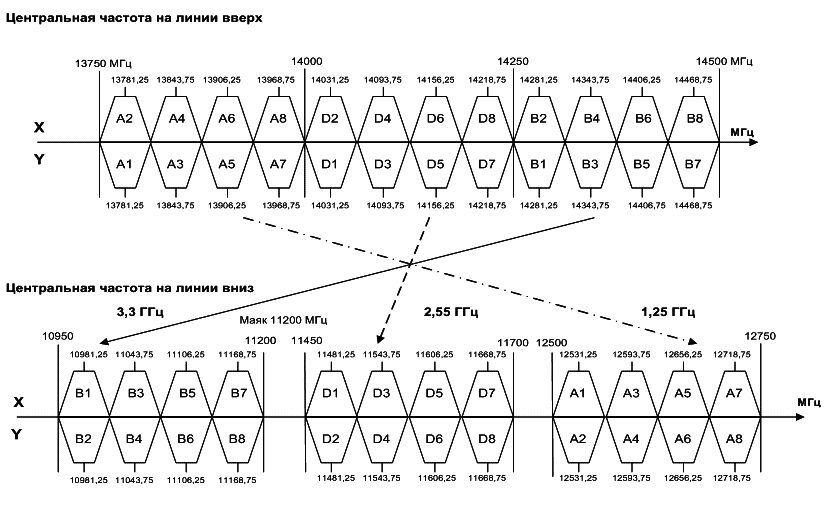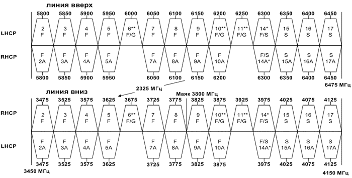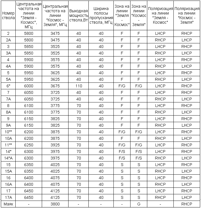 * - 10 транспондеров (40W), ** - 9 транспондеров (70W), *** - 1 транспондер (110W)
